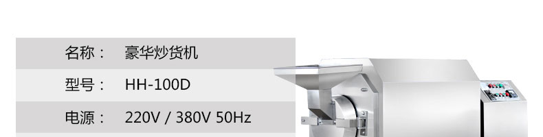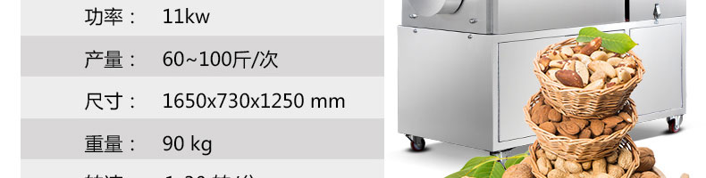 名稱豪華型100D炒貨機 電源220/380V(見機器銘牌) 功率11kw 產量60-100斤/次 尺寸1650*730*1250mm 重量90kg 規格 其他