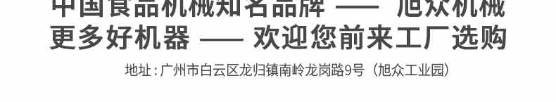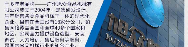 廣州旭眾食品機械有限公司是一家集科研開發,生產設計,營銷服務為一體的現代化生產企業。現代化生產車間,精湛制造技術,所產機械歷經市場重重考驗,不斷贏得海內外客戶的贊譽。