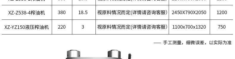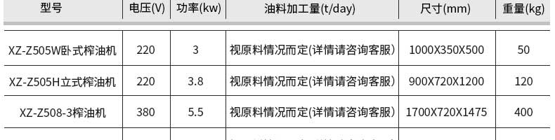 名稱XZ-YZ150型液壓榨油機 電源220v 功率3kw 產量9kg/次 尺寸1100*700*1320mm 重量700kg 規格 其他